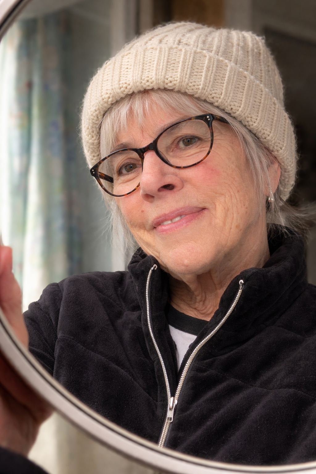 Testar av det grå håret stack fram under den stickade luvan.