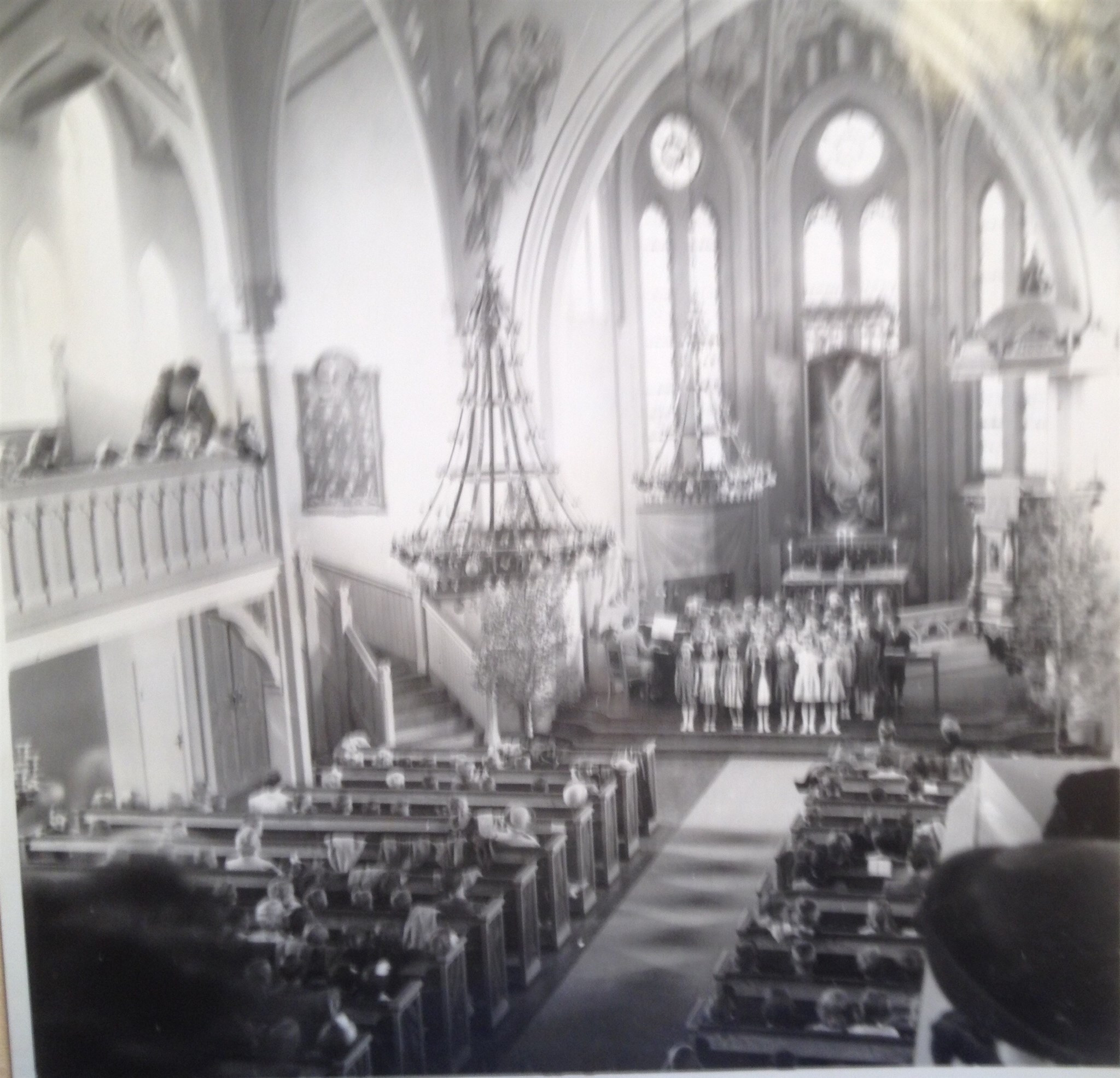 Skolavslutning i Vindelns kyrka juni 1952. Jag står i första ledet, tvåa från höger. Hade en gul klänning med vit krage - inte hemmasydd!! Den fick tyvärr fula maskrosfläckar som inte gick att få bort...